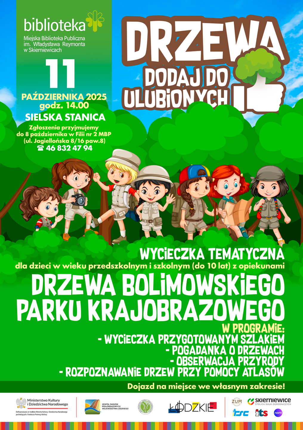 Zespół Parków Krajobrazowych Województwa Łódzkiego Oddział Bolimowskiego Parku Krajobrazowego oraz Miejska Biblioteka Publiczna w Skierniewicach zapraszają rodziny z dziećmi na wycieczkę tematyczną "Drzewa Bolimowskiego Parku Krajobrazowego", która odbędzie się 11 października 2025 roku. Zbiórka w ośrodku Sielska Stanica w Budach Grabskich. Dojazd na miejsce we własnym zakresie. Obowiązują zapisy - liczba miejsc ograniczona!