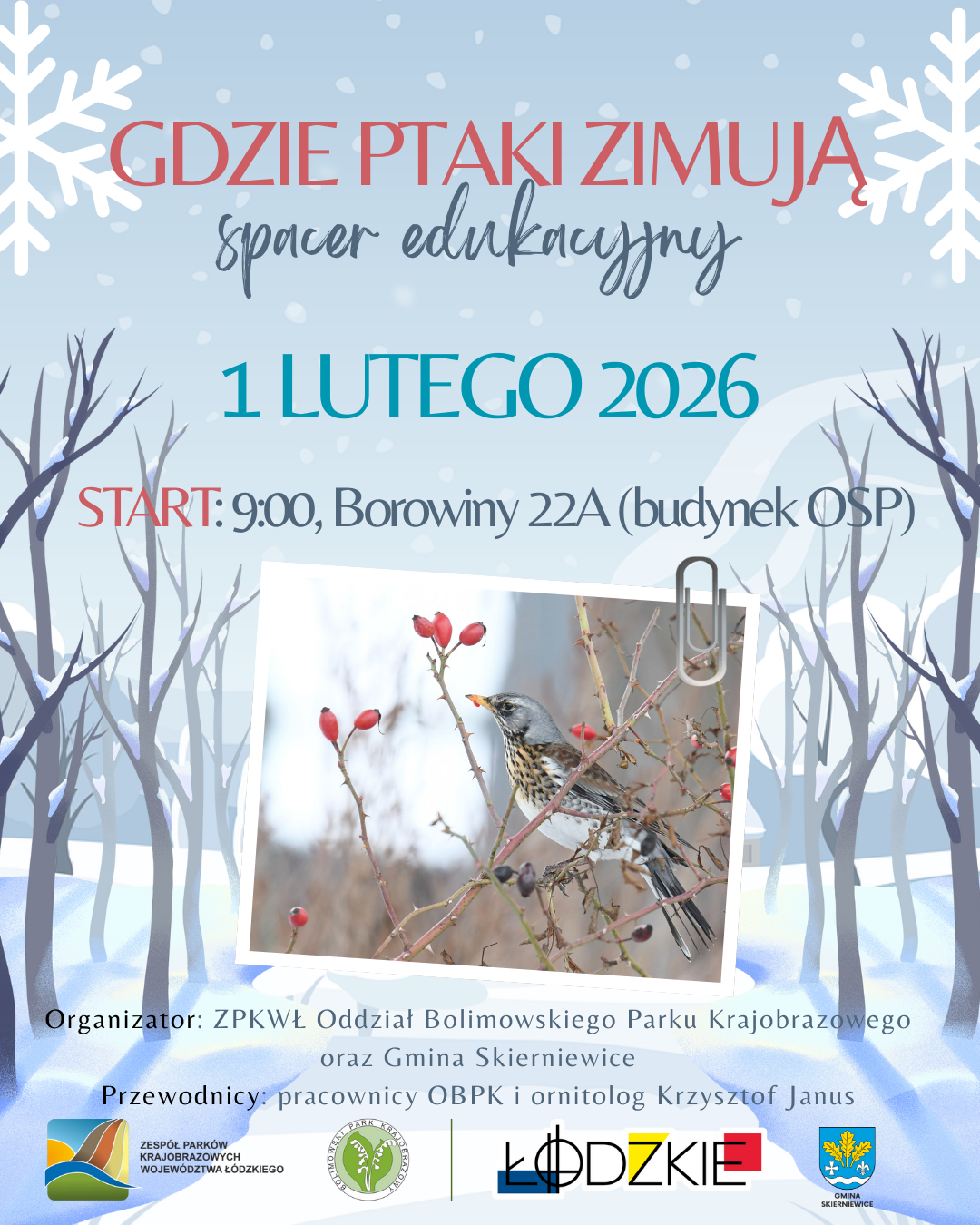Zespół Parków Krajobrazowych Województwa Łódzkiego - Oddział Bolimowskiego Parku Krajobrazowego oraz Gmina Skierniewice zapraszają wszystkich miłośników ptaków oraz amatorów pieszych wycieczek przyrodniczych do przyłączenia się do spaceru edukacyjnego „Gdzie ptaki zimują”.