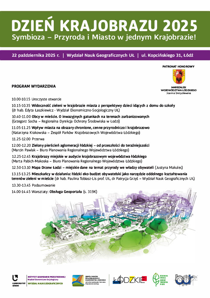 Instytut Gospodarki Przestrzennej i Wydział Nauk Geograficznych Uniwersytetu Łódzkiego wraz z Zespołem Parków Krajobrazowych Województwa Łódzkiego zapraszają na Dzień Krajobrazu 2025, który odbędzie się 22 października br. na Wydziale Nauk Geograficznych UŁ pod Patronatem Honorowym Marszałka Województwa Łódzkiego, Pani Joanny Skrzydlewskiej. Tegorocznym hasłem przewodnim wydarzenia będzie „Symbioza - Przyroda i Miasto w jednym Krajobrazie!”