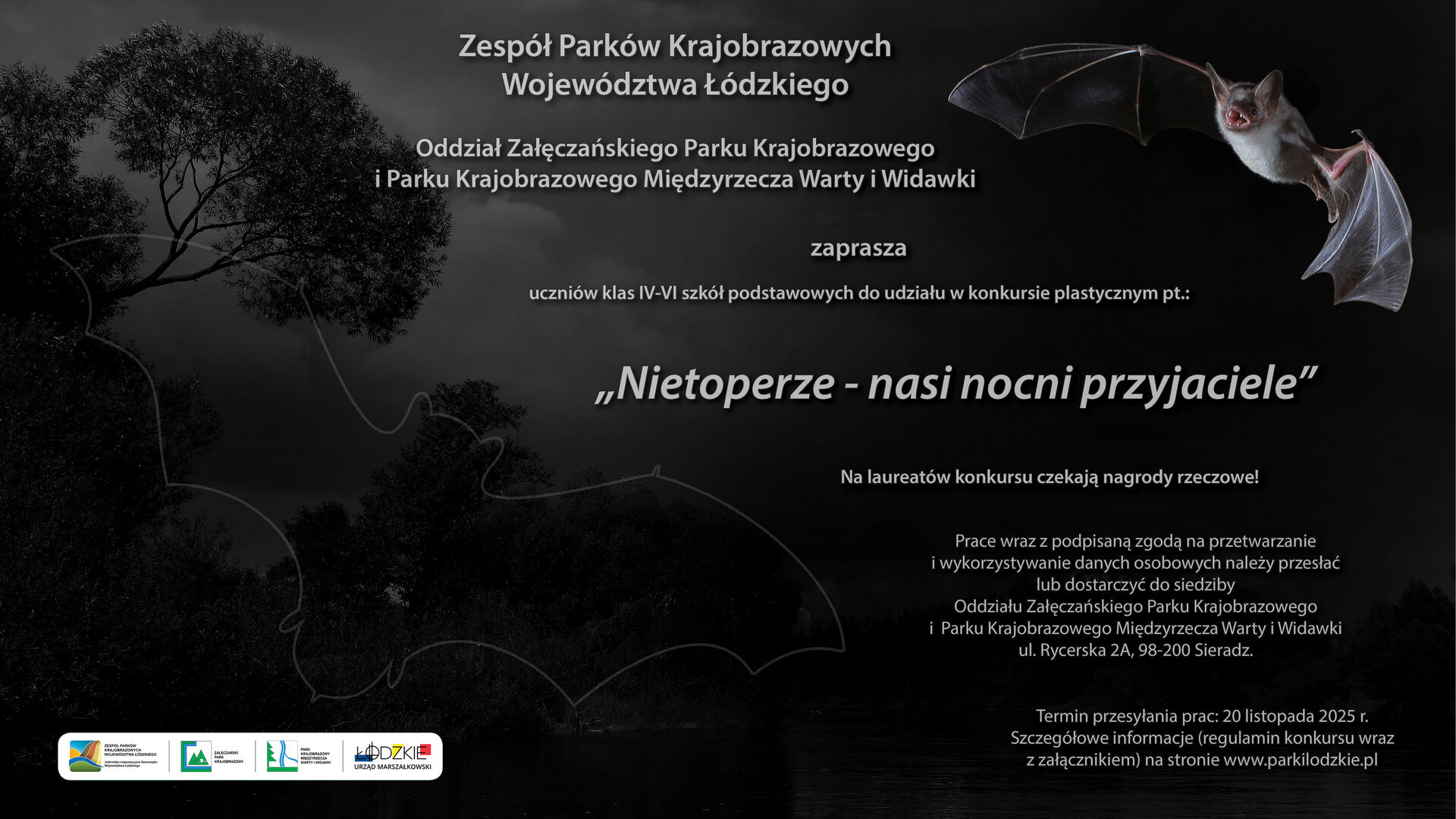 Zespół Parków Krajobrazowych Oddział Załęczańskiego Parku Krajobrazowego i Parku Krajobrazowego Międzyrzecza Warty i Widawki zaprasza uczniów klas IV-VI szkół podstawowych do udziału w konkursie plastycznym pt. „Nietoperze - nasi nocni przyjaciele”.
