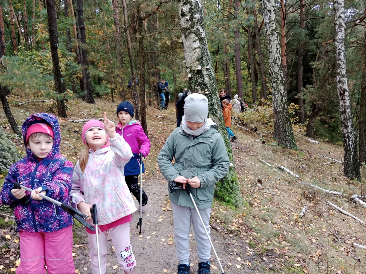 Podczas spaceru uczyliśmy się rozpoznawania poszczególnych gatunków drzew rosnących na trasie. Udało się nam oznaczyć między innymi: lipę drobnolistną, klon zwyczajny, klon jawor, sosnę zwyczajną, świerk pospolity, grab, brzozę, dąb szypułkowy i dąb czerwony. Rozmawialiśmy również o zwierzętach, które korzystają z drzew: obserwowaliśmy chociażby kuźnię dzięcioła, zgryzy, nory i tamę bobrów, dziuplę czy galasy na liściach dębu. Udało się nam zobaczyć jedynego w Polsce jadowitego gada – młodą żmiję zygzakowatą.