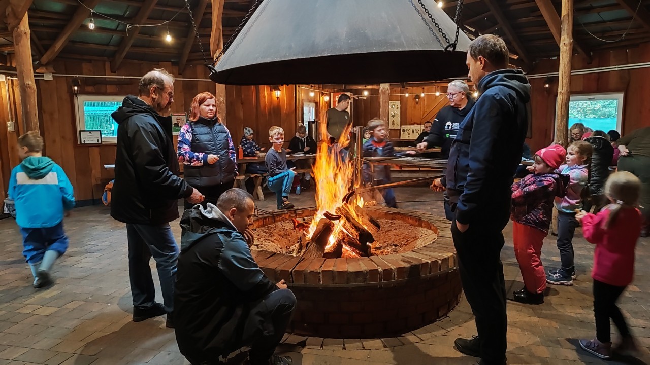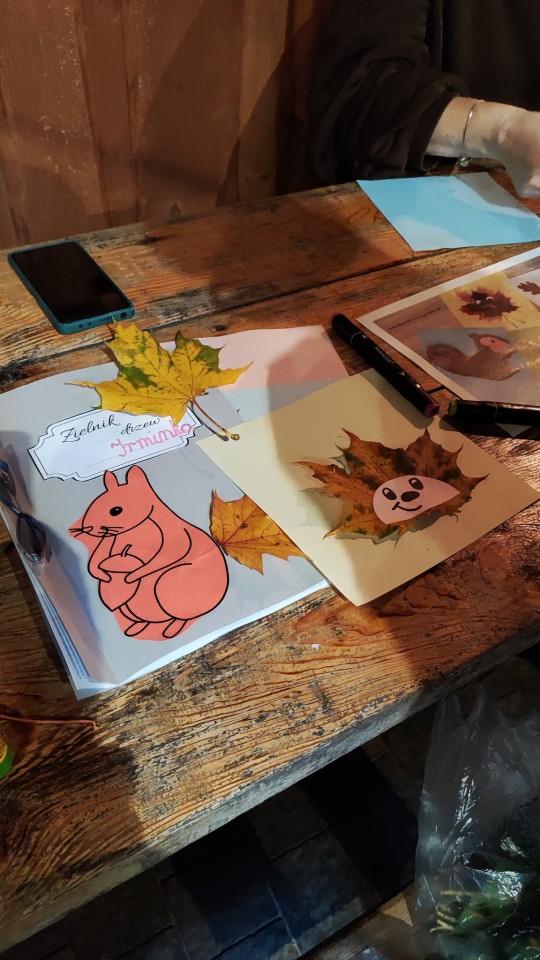 Po powrocie na Sielską Stanicę w Budach Grabskich, rozpoczęliśmy część warsztatową zajęć. Rodziny usiadły do stołów i utrwalały wspólnie wiedzę, tworząc zielnik oraz prace plastyczne z zebranych liści. Na koniec spotkania czekało na wszystkich ognisko i ciepły poczęstunek.