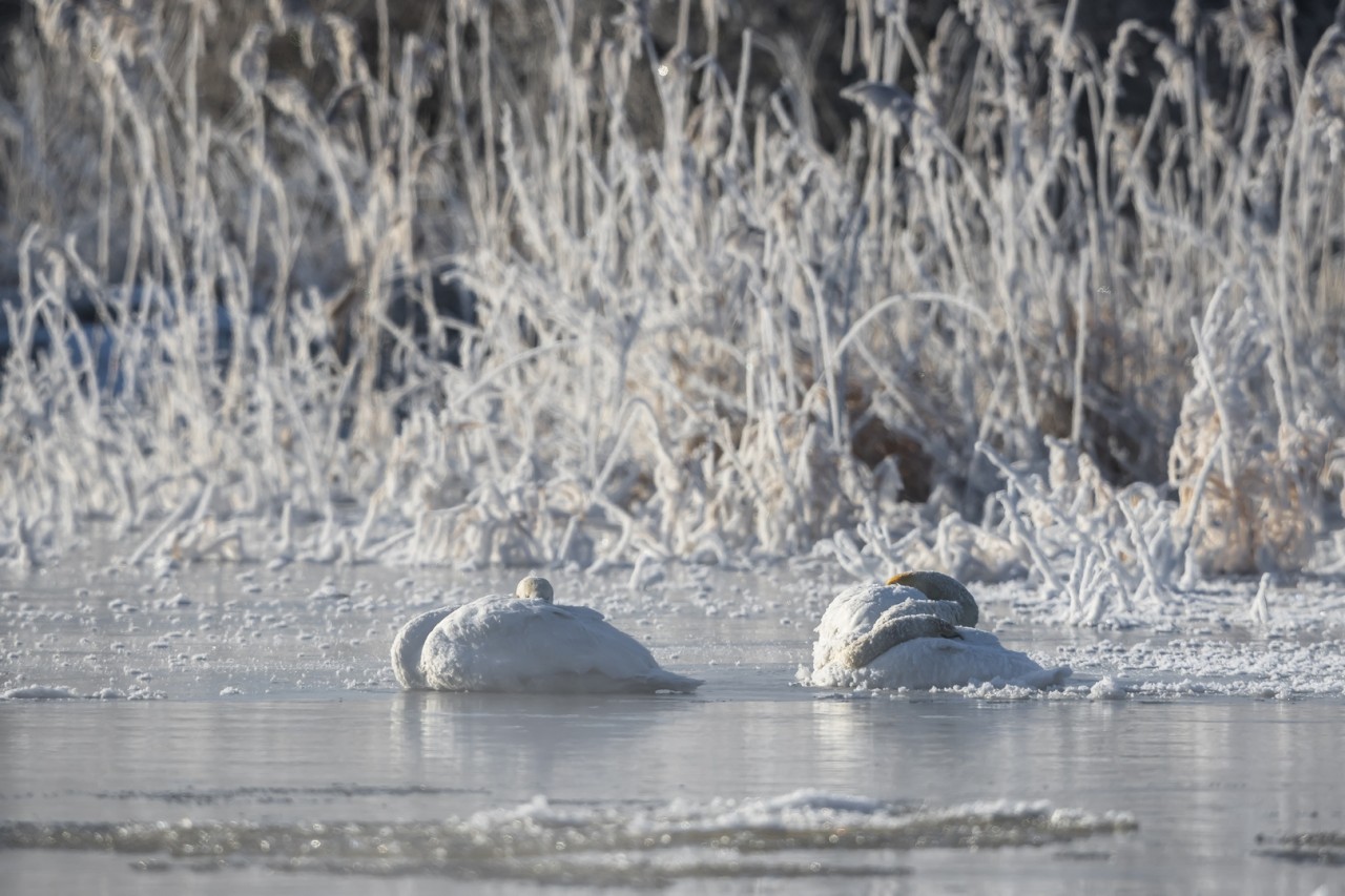 - W zamarzniętym korycie rzeki, w pełnym spokoju, śpią łabędzie, czekając na cieplejszy powiew wiatru.