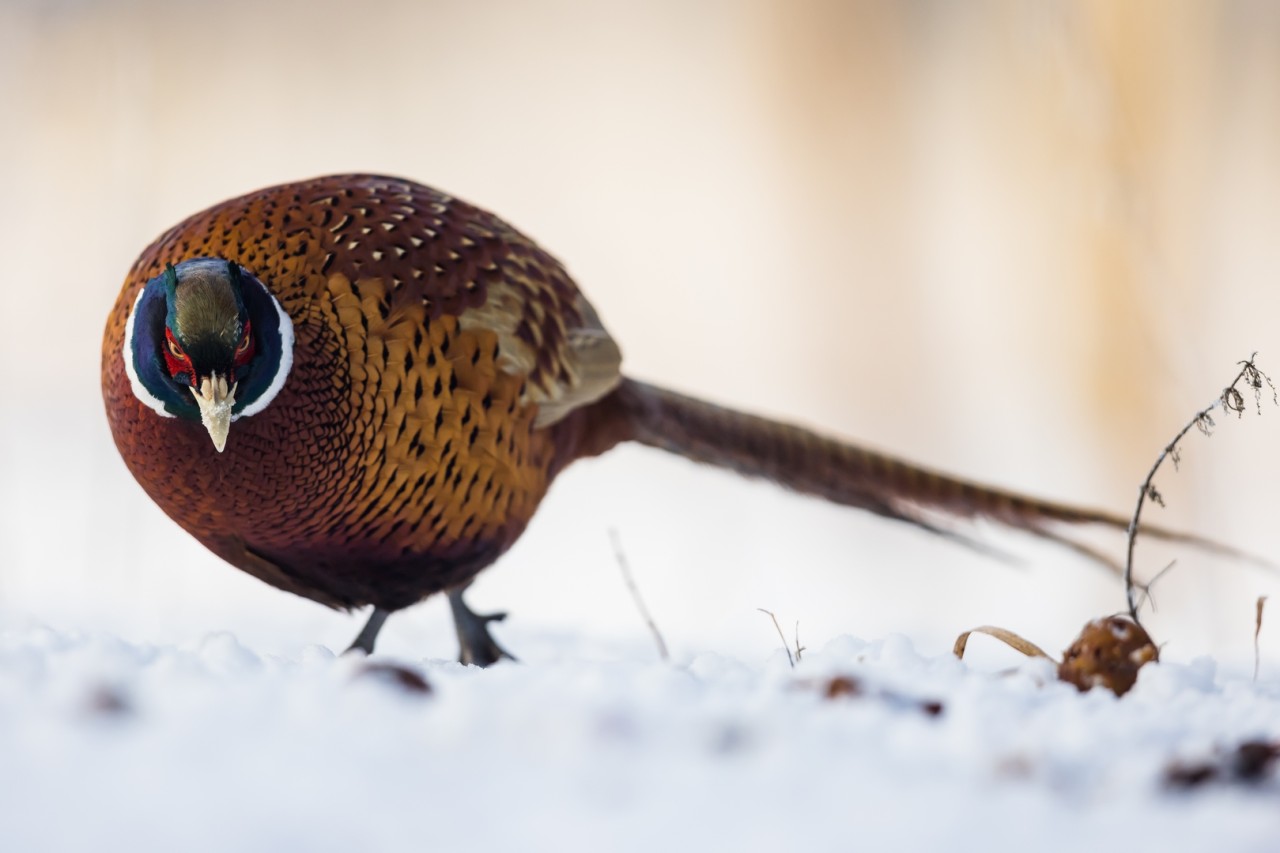 - Bażant dumnie kroczy przez oszroniony sad, odnajdując przetrwałe, zmarzłe jabłka.