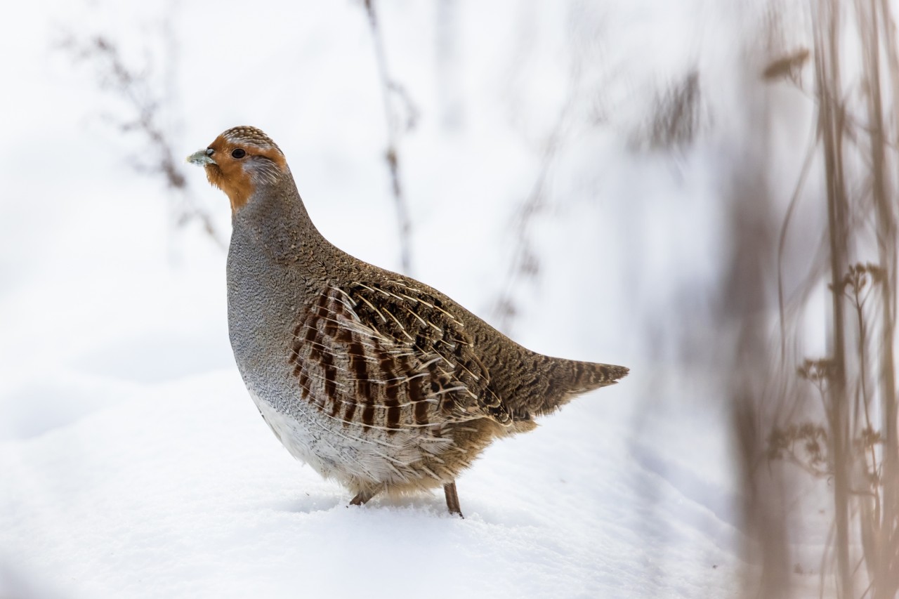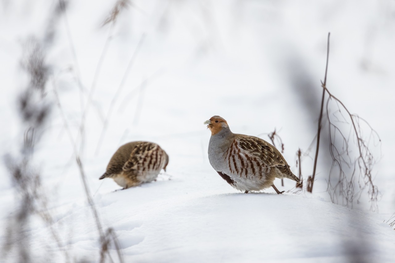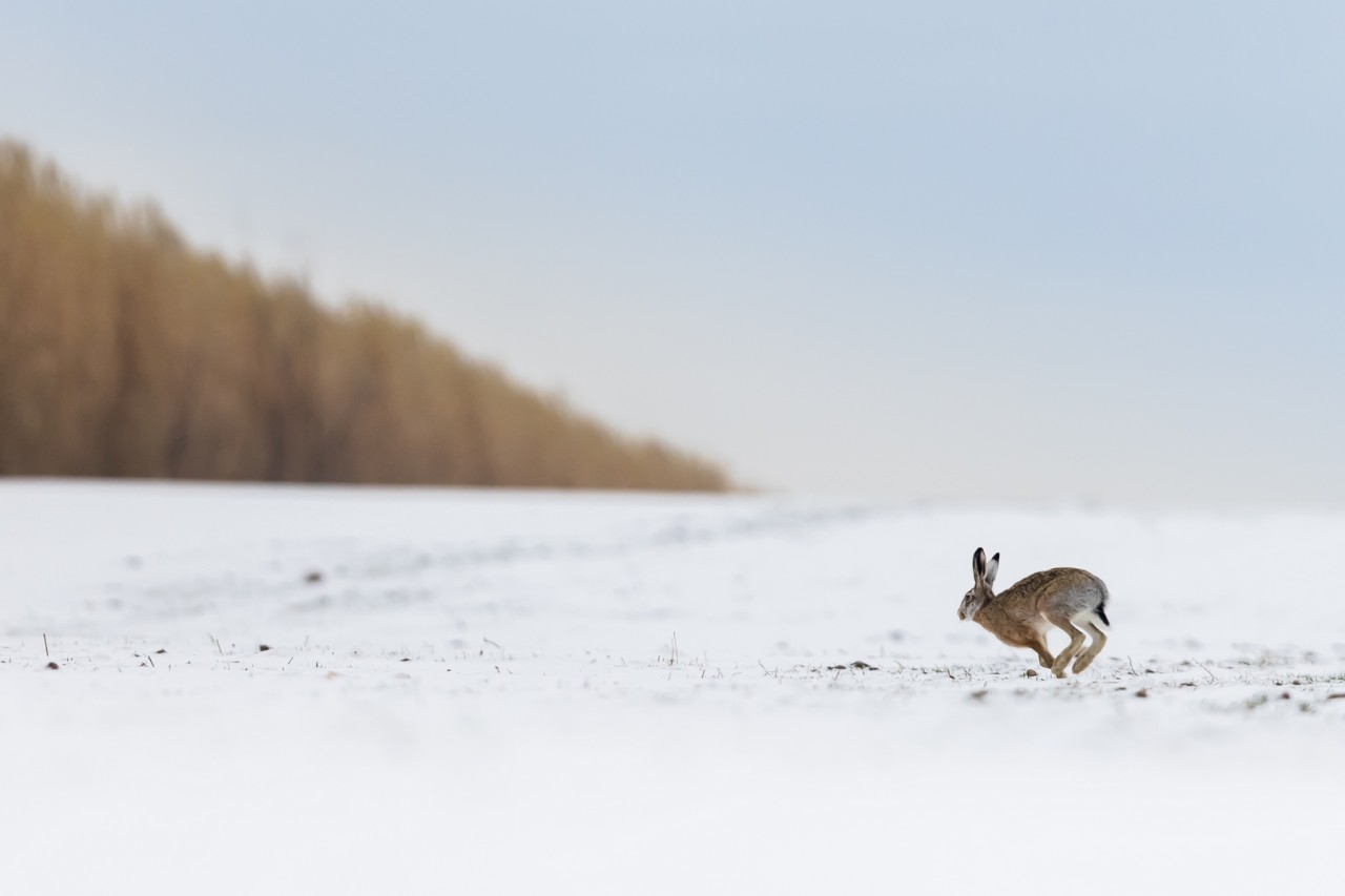 - Płochliwa kuropatwa szuka schronienia w głębokiej zaspie, a zając przecina białe pola w dynamicznym biegu.