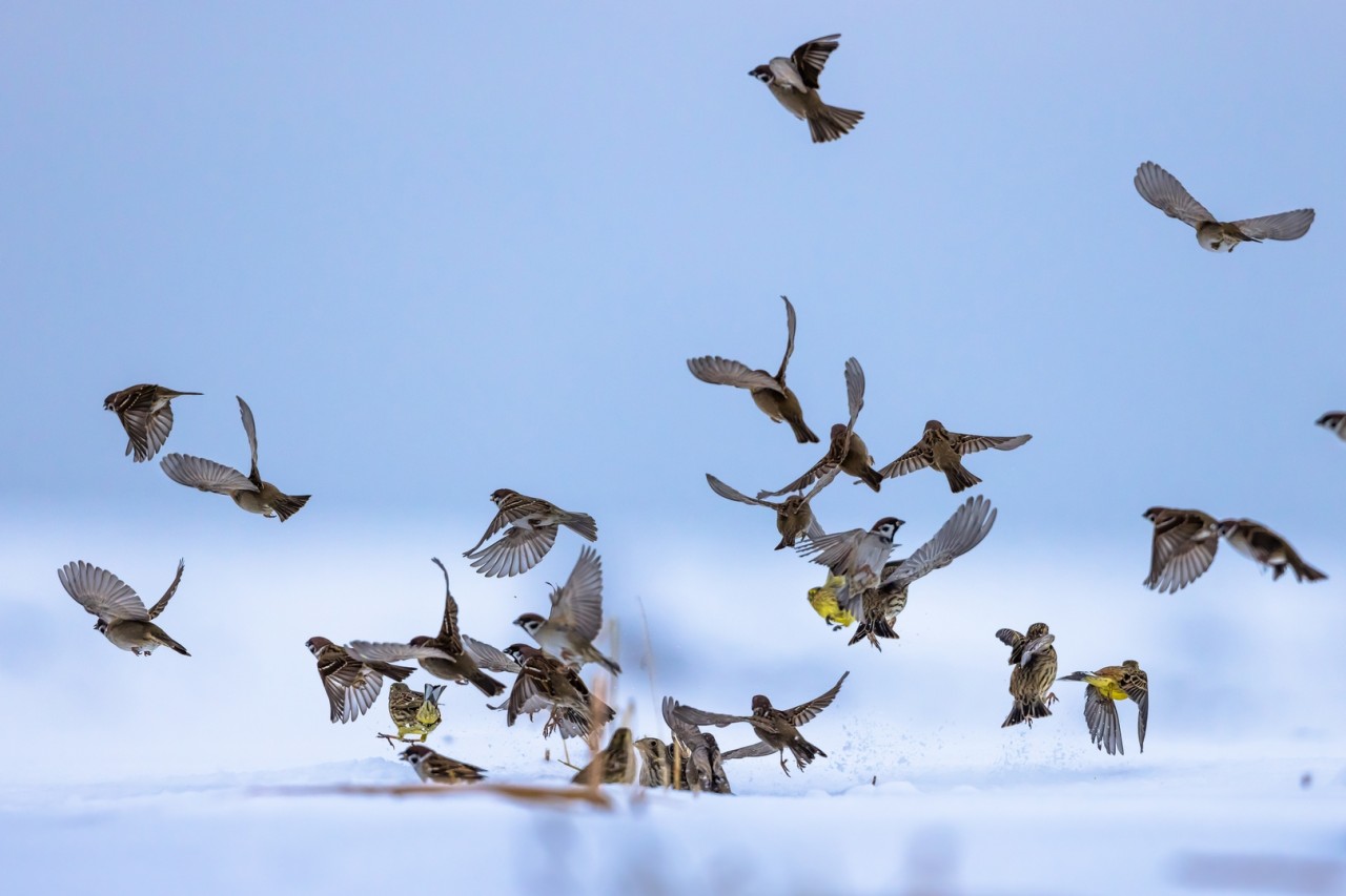 - Na tle zaśnieżonych łanów migoczą skrzydła sójki, a w locie mienią się radosne stada mazurków, potrzeszczy i trznadli.
