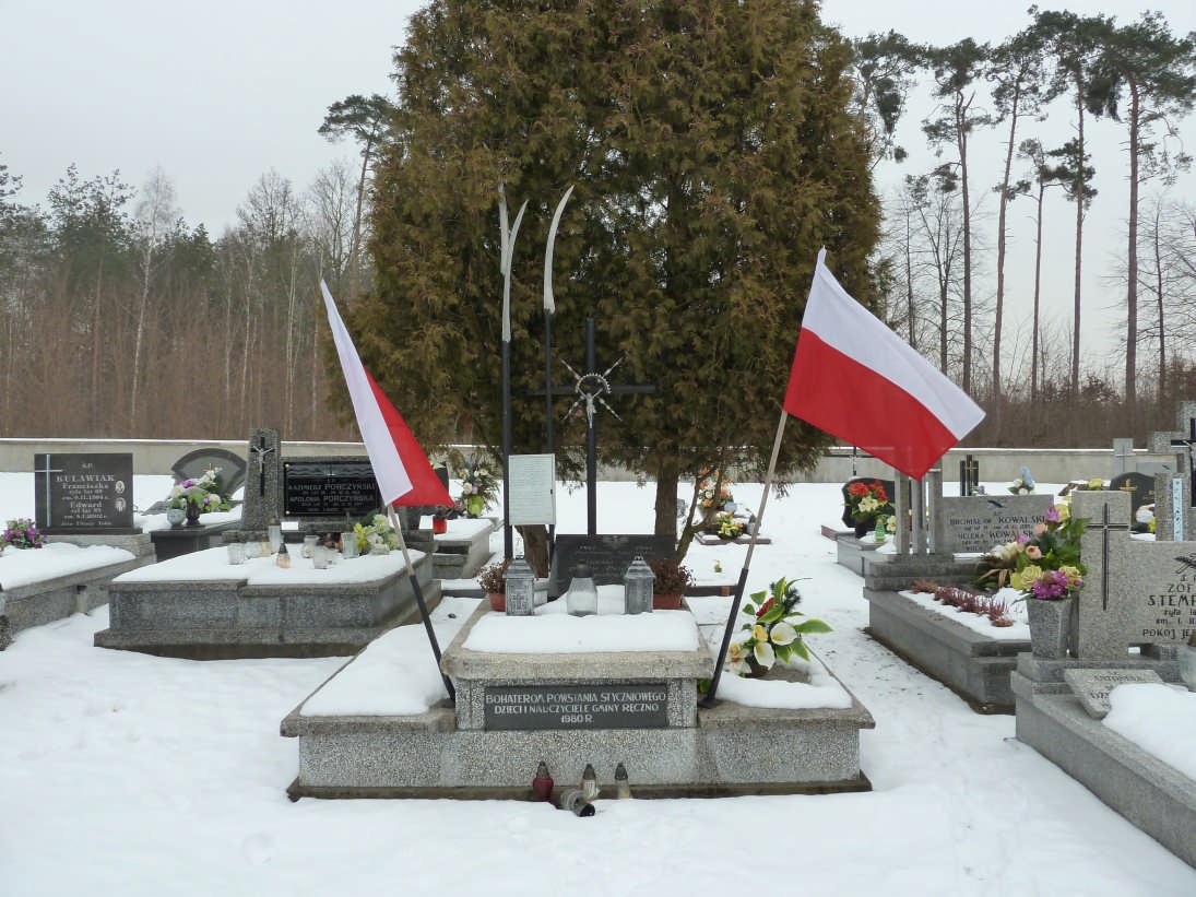 - Ręczno – na cmentarzu rzymskokatolickim znajduje się mogiła zbiorowa 5 nieznanych powstańców poległych w bitwie na Młynkach Plebejskich nieopodal Ręczna 2 lutego 1864 roku. Znajduje się tu także mogiła weterana z 1863 roku, Stanisława Okszy-Strzeleckiego.
