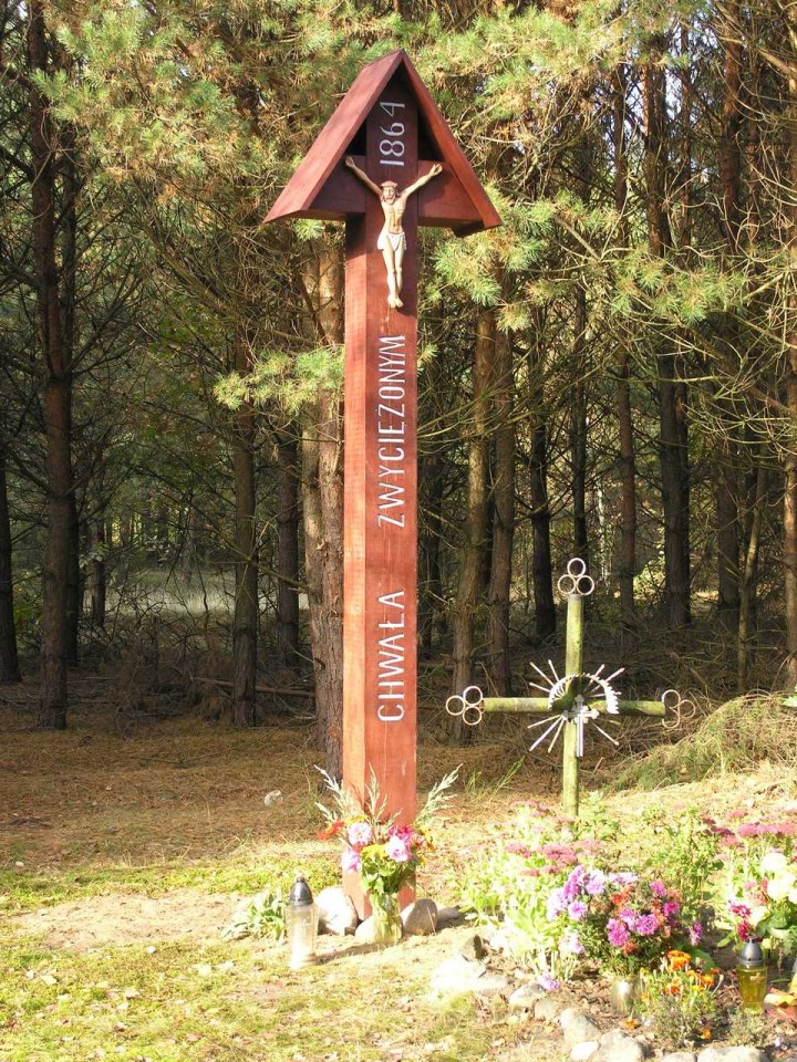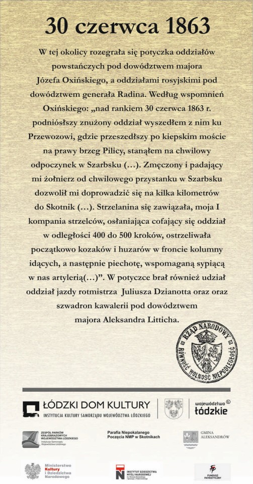 - Skotniki – drewniany krzyż z tablicą objaśniającą przebieg potyczki oddziałów powstańczych pod dowództwem majora Józefa Oxińskiego z oddziałami rosyjskimi pod dowództwem generała Radina. Według wspomnień Oxińskiego: „nad rankiem 30 czerwca 1863 r. podniósłszy znużony oddział wyszedłem z nim ku Przewozowi, gdzie przeszedłszy po kiepskim moście na prawy brzeg Pilicy, stanąłem na chwilowy odpoczynek w Szarbsku (…). Zmęczony i padający mi żołnierz od chwilowego przystanku w Szarbsku dozwolił mi doprowadzić się na kilka kilometrów do Skotnik (…). Strzelanina się zawiązała, moja I kompania strzelców, osłaniająca cofający się oddział w odległości 400 do 500 kroków, ostrzeliwała początkowo kozaków i huzarów w froncie kolumny idących, a następnie piechotę, wspomaganą sypiącą w nas artylerią(…)”.