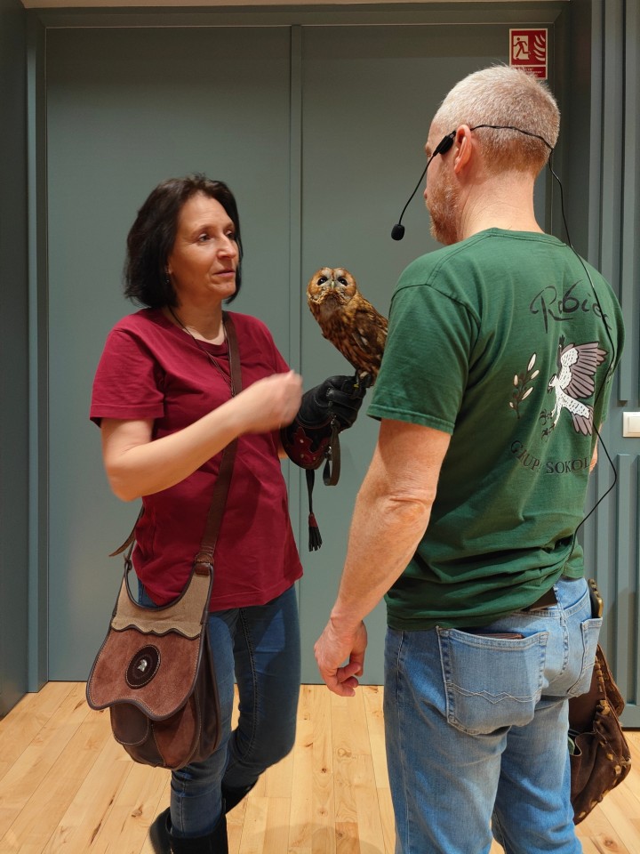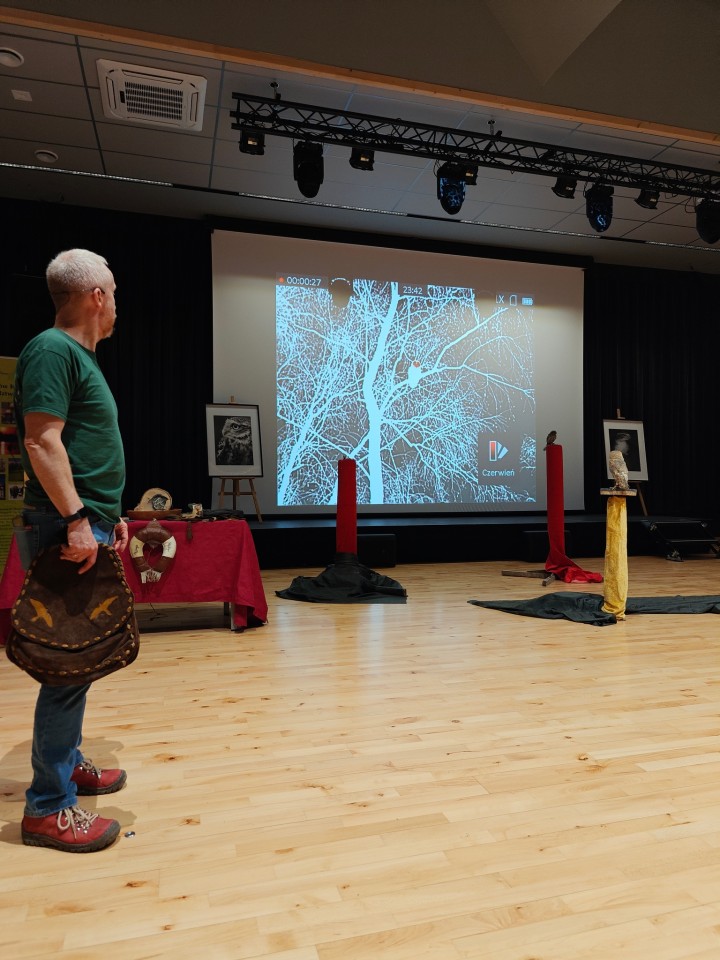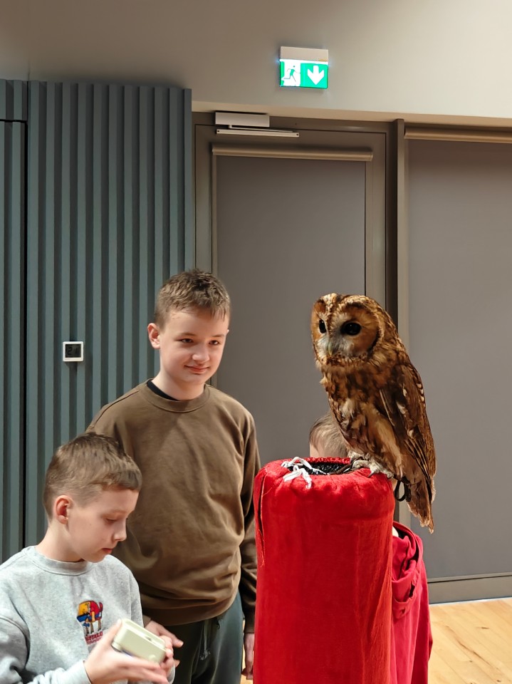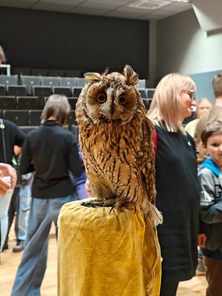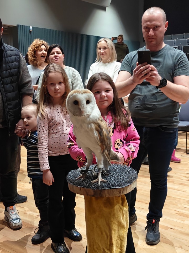 To wyjątkowe spotkanie było prowadzone przez Panią Ewę i Pana Roberta Puławskich z grupy sokolniczej „Rabiec”. Uczestnicy mieli możliwość wysłuchania informacji dotyczących budowy, trybu życia, lęgów, różnic gatunkowych sów oraz metod ich ochrony. Największe wrażenie zrobiła możliwość zobaczenia na żywo tych pięknych i tajemniczych ptaków. Sokolnicy prezentowali sowy pochodzące z hodowli, posiadające odpowiednie dokumenty, zgody i certyfikaty. Zgromadzeni mogli podziwiać płomykówkę, pójdźkę, uszatkę, puszczyka i okazałego puchacza. Wyświetlony został także krótki film z sowami w roli głównej. Blisko 150 osób z różnych części naszego województwa z wielkim zainteresowaniem uczestniczyło w tym wydarzeniu, co napawa nas ogromną radością i utwierdza w przekonaniu, że tego typu forma edukacji przyrodniczej jest bardzo dobrze odbierana.